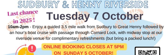 Our popular Walk ‘n’ Water experiences – a combination of walking by the river and boating on the river. All proceeds to the restoration and conservation of the River Stour Navigation for the benefit and education of the public. Enjoy a guided walk and river cruise along the Sudbury and Henny Riverside. BOOK HERE