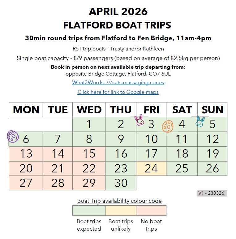 | Flatford Trips | Refer to monthly timetable | 30 mins | 11am-4pm | Walk on / book in person |